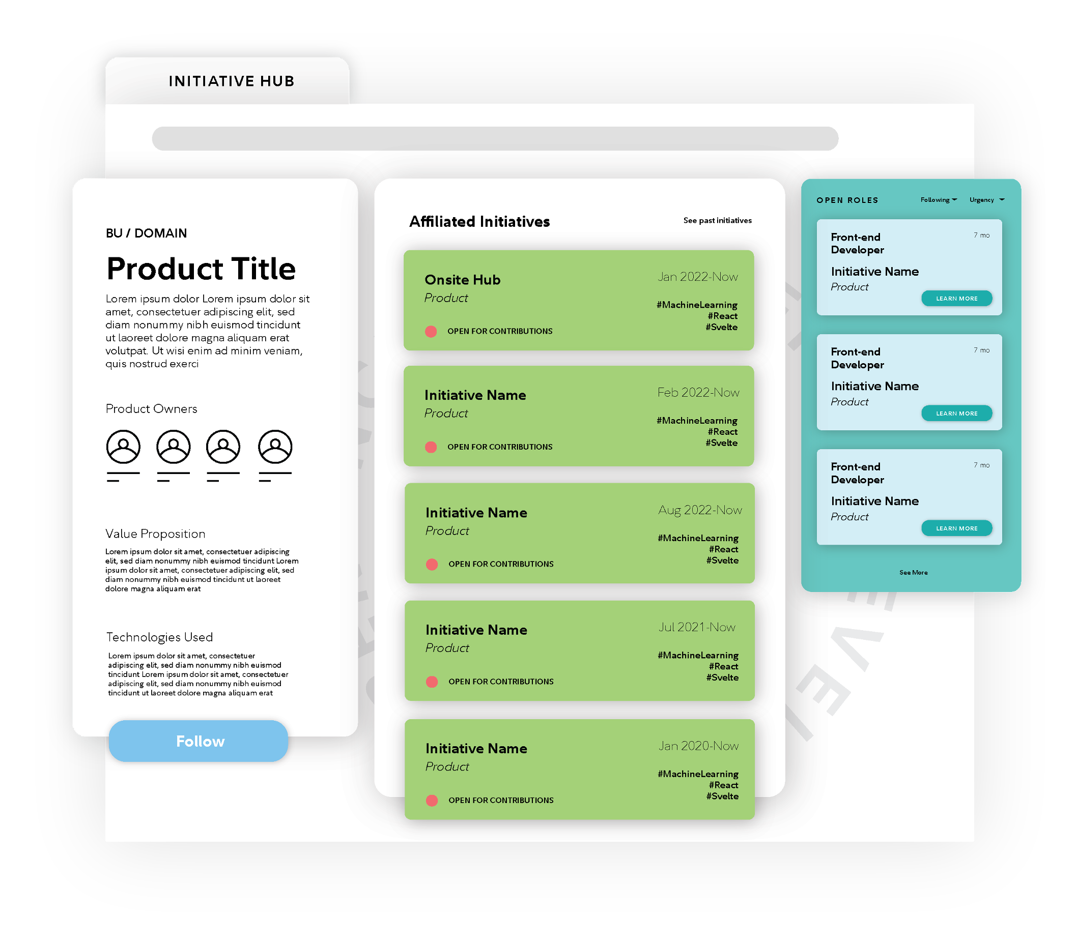 A consistent theme in interviews with tech associates was a general lack of awareness of other work happening around them. Associates loved hearing about others’ work — it was a great way of finding inspiration and potential collaborators — but absent physical proximity, most didn’t have an easy way of keeping up. Enter Initiative Hub. First and foremost, it’s created to help tech associates connect and follow interesting work; it also has secondary uses in reducing redundant initiatives and filling open roles internally.